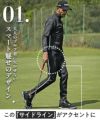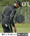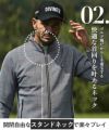 ジャケットのフロントジップとパンツのベルトループ付きウエストが、スタイリッシュさときちんと感を両立。 パンツのフロント・バックに備えたポケットやバックの Dカンなど、ラウンド中に必要な機能もセットで しっかり装備しています。
