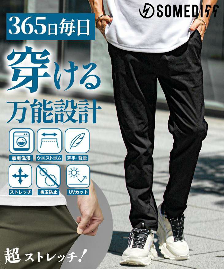 カラッとした肌ざわりの軽やかな素材で、 夏でも快適な穿き心地。 スーパーストレッチ生地だから、 動きやすさもバッチリです。