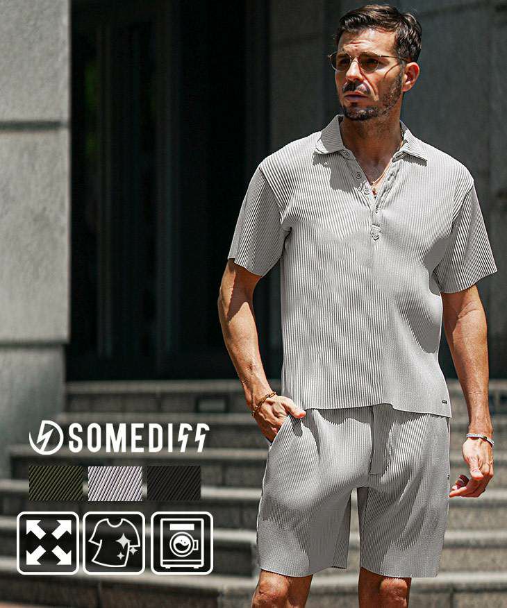 リラックス感と上品さを兼ね備えた、プリーツポロシャツ &ハーフパンツのセットアップ。 細かなプリーツが縦のラインを美しく引き立て、 すっきりとした印象を与えながらも、着心地は驚くほどやわらか。 しっとりと肌になじむ生地は、まるでトロンと落ちるような質感で、 シワになりにくく、お手入れも簡単。