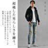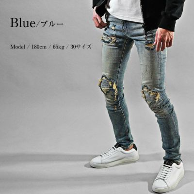 膝元のダメージにはバイカーデニムのような ウェーブステッチでリペアし、センスを魅せつける。