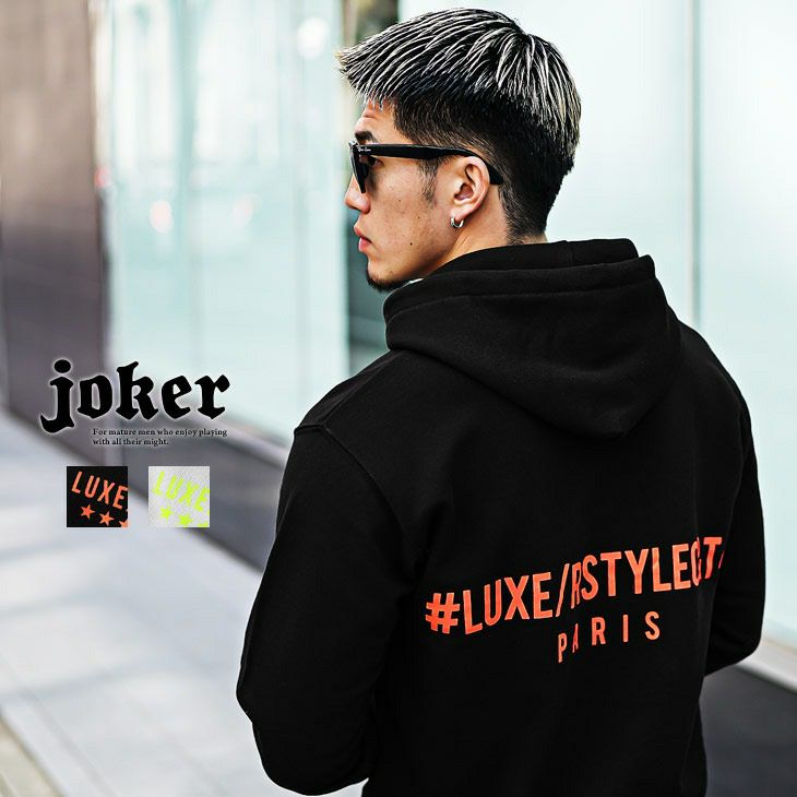 ベーシックなパーカーに 左胸にはロゴ、バックにはビッグロゴデザインを ネオンカラー(蛍光色)で配置することで さりげなく存在感を出す仕上がりに。