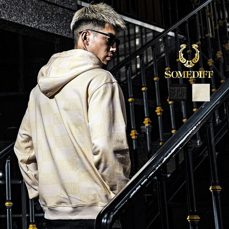正面はフロント部分にワンポイントでロゴを配置し、 バック部分は総柄でデザインを利かせたパーカー。