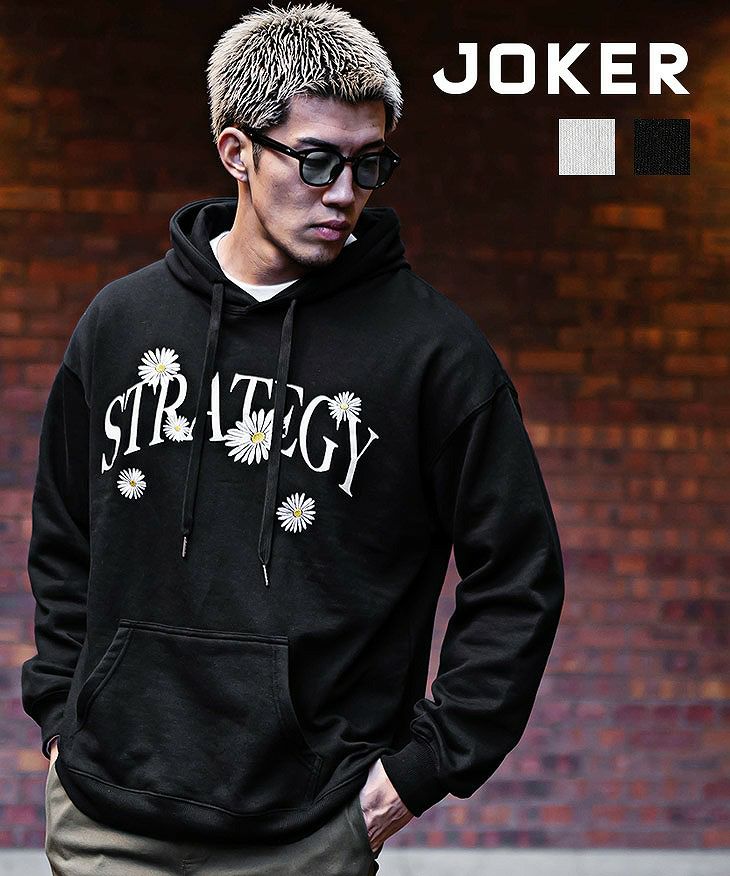 フラワー柄の刺繍デザインを 胸元に配置した裏毛素材のプルオーバーパーカー。