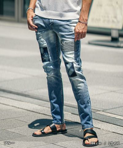 ダメージ加工とパッチワークが施された、 立体感と動きのある表情豊かなデザインデニムパンツ。 丁寧に施された美しいブリーチ加工が、他のデニムとは一線を画す存在感を放ち、コーディネートに抜群の個性を与えます。