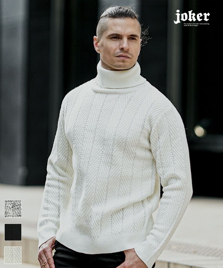立体感のあるデザインが、 高級感を漂わせる ヘリンボーンケーブル柄タートルニット。