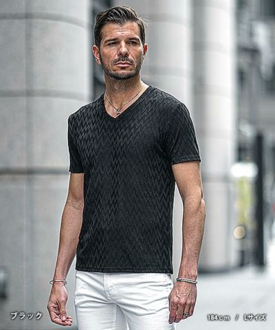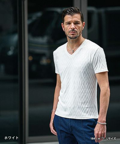 立体感のあるパイルシェブロン半袖VネックTシャツが、 シンプルなのに奥行きある表情を 生み出すVネックTシャツ。