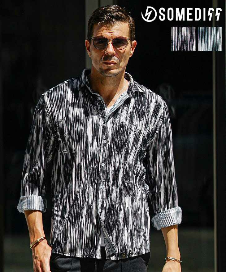 生地全体に凹凸があり、 立体的な表情を見せるプリーツ素材に 総柄をデザインし、存在感を発揮させるこのシャツ。