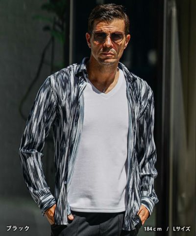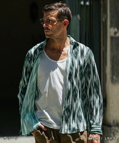 風に揺れる洒落感を纏う、 総柄の長袖プリーツシャツ。