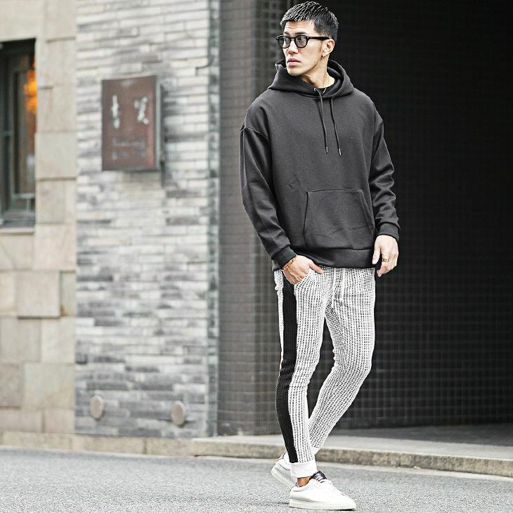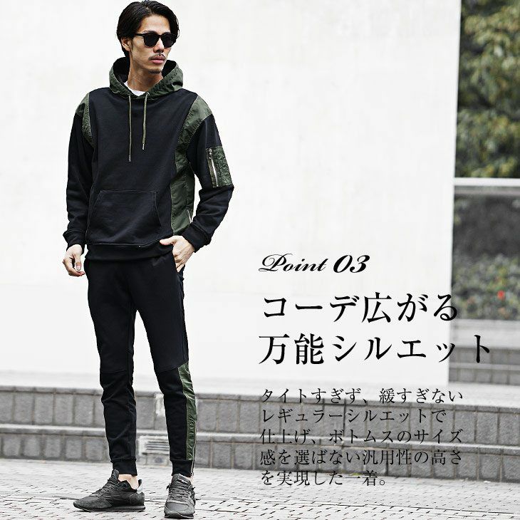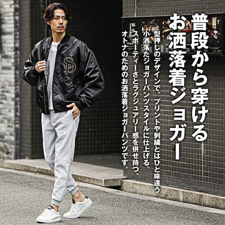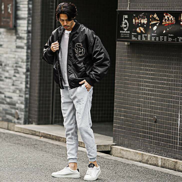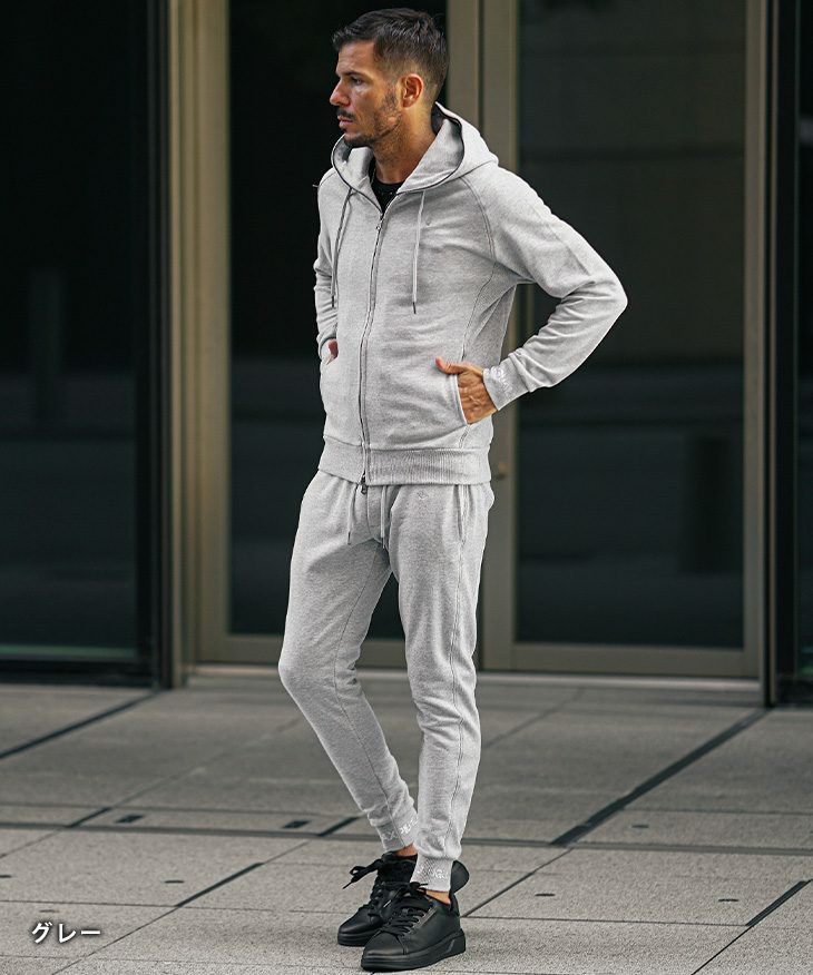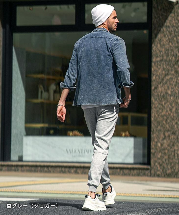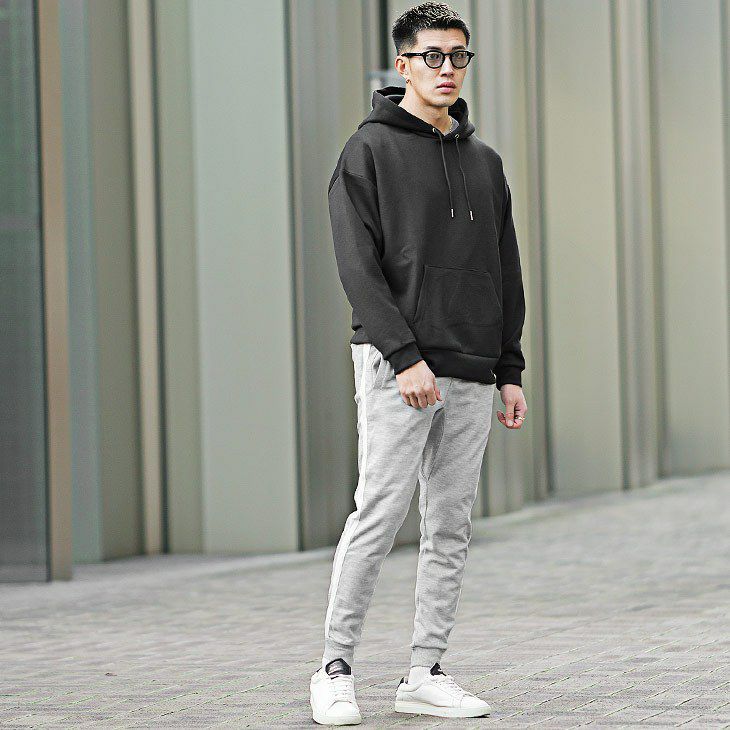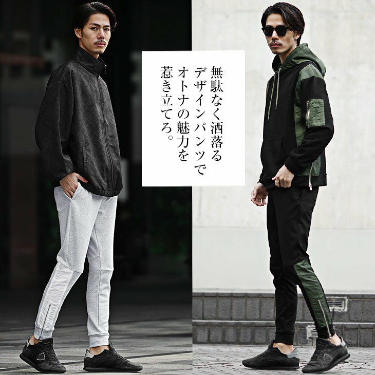 いまやメンズファッションコーデの定番のアイテムになりつつあり、スウェット素材・ジャージ素材が多い。