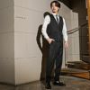 ジャケットの肩幅はピッタリです。袖丈は手首くらいの長さで、着丈はお尻が半分隠れる長さです。ジレはちょうど良いサイズ感で、胸周りはピッタリ、お腹周りは少しゆとりがあります。パンツはウエストが拳1個分の余裕があり、太もも、ふくらはぎは少しゆとりがあります。