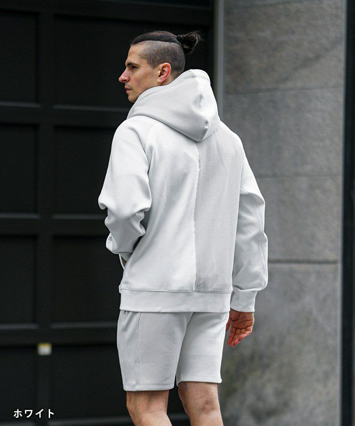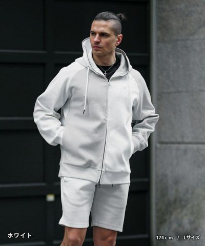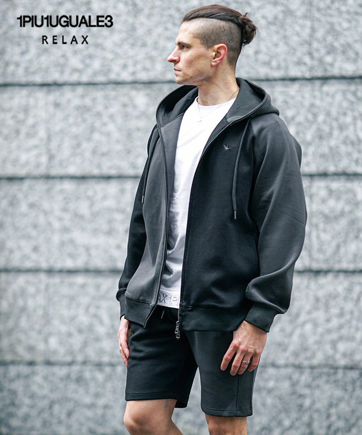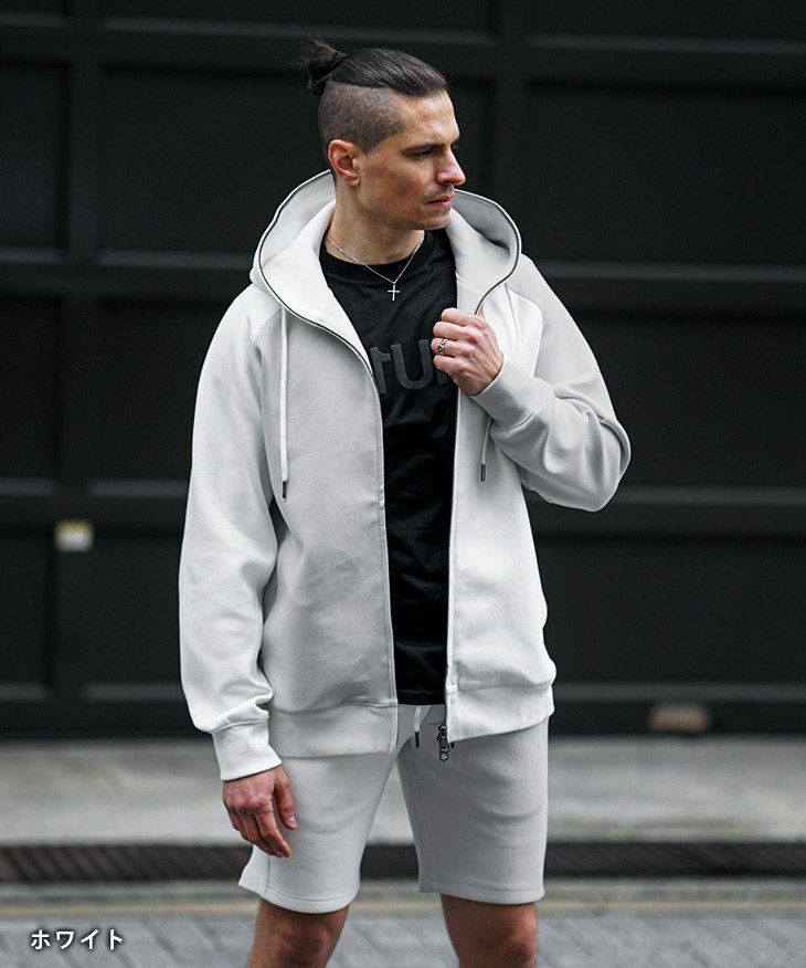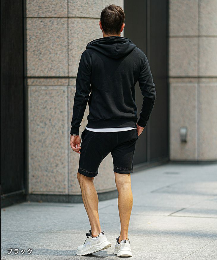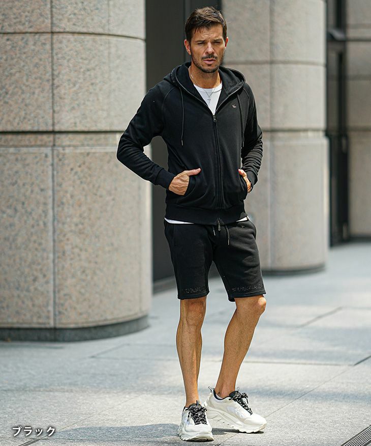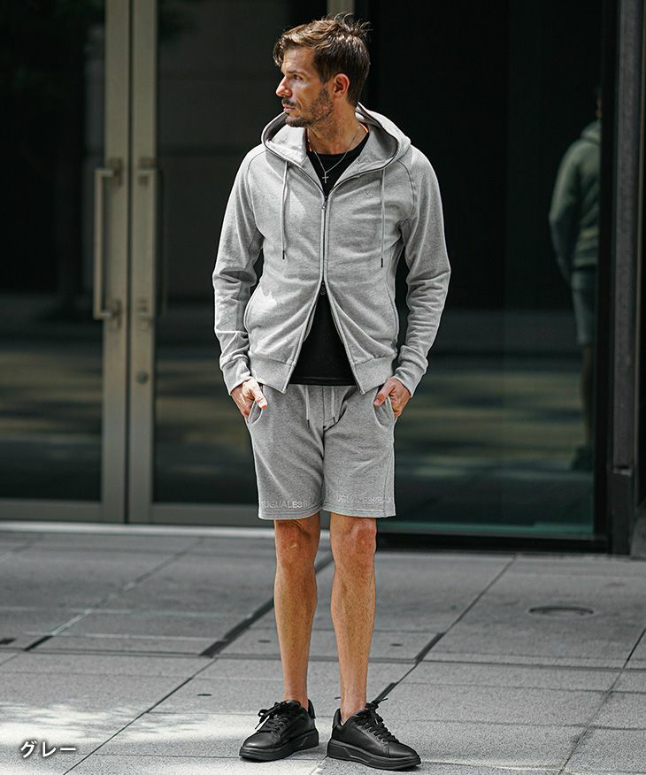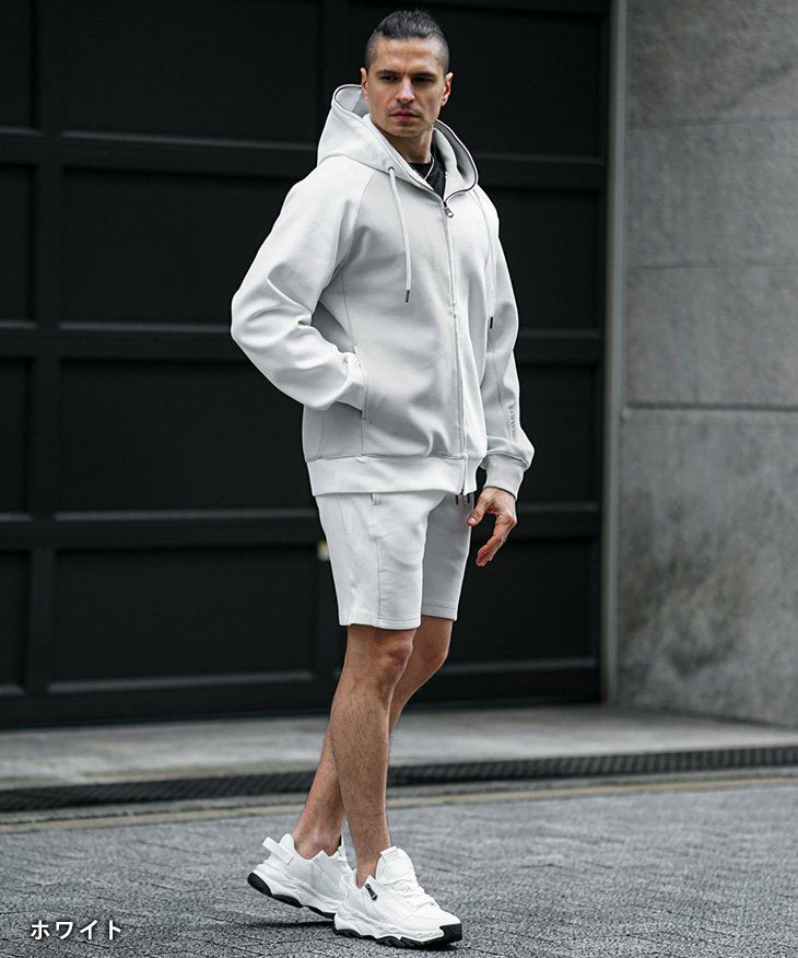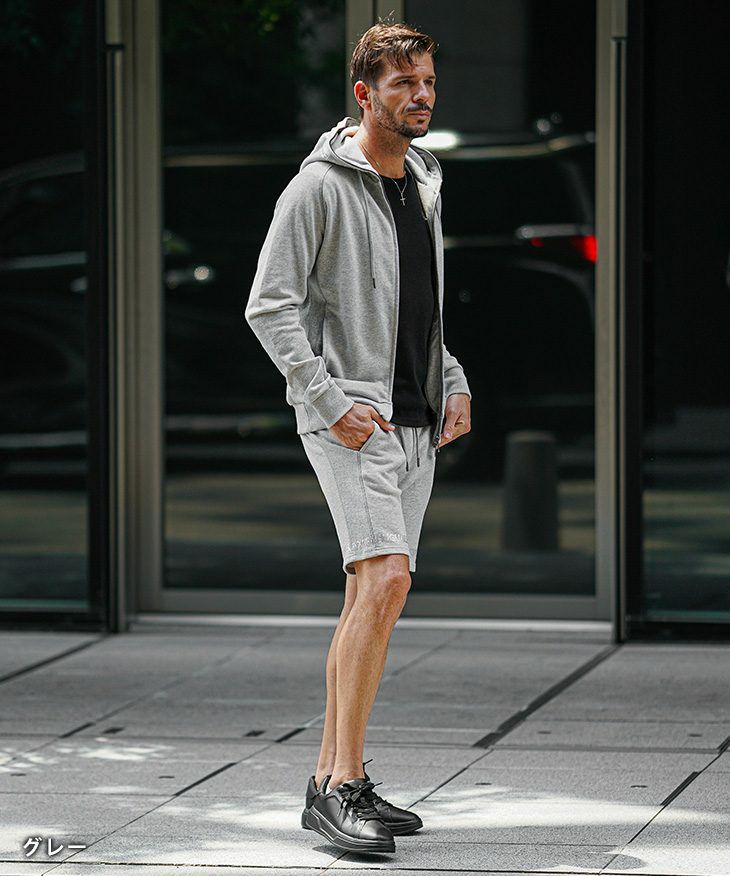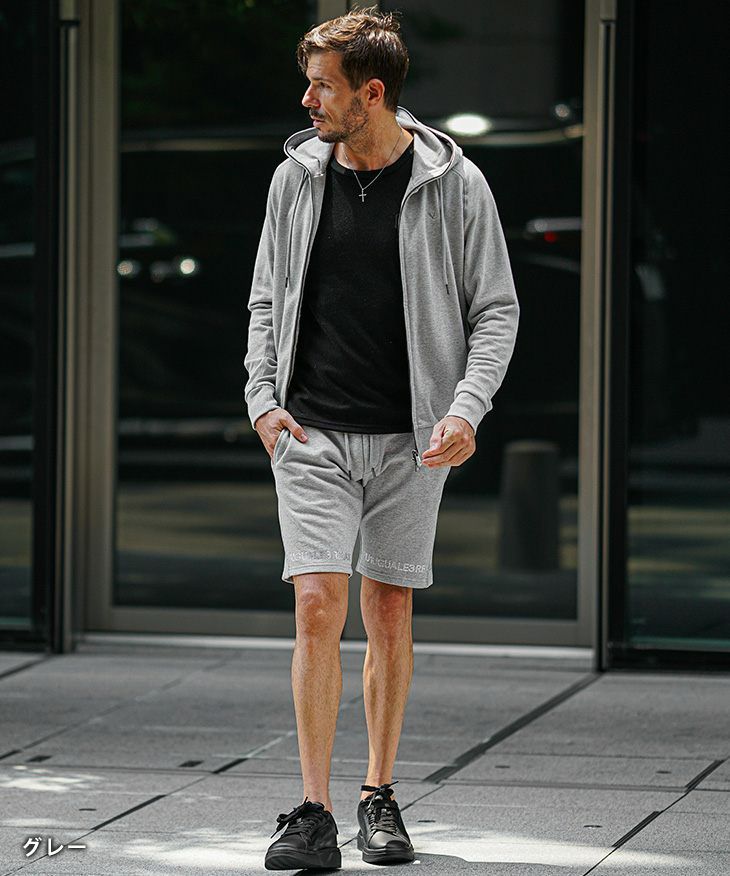 パーカーや半袖トップス、ショーツなどを使った、ラフさと統一感を兼ね備えたスタイル。