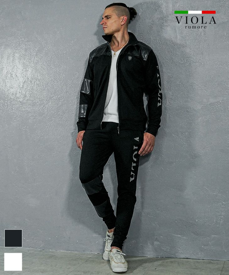 レザーの切り替えが目を惹くスタンドジャケット とイージーパンツのセットアップ。