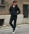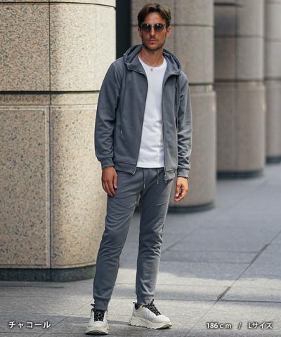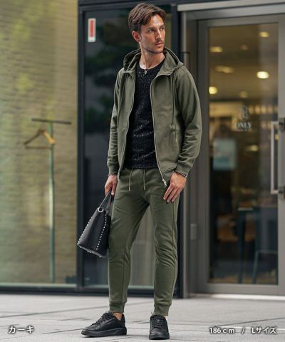 [Lサイズ]を着用しました 他コーデは【コチラ】 程よく余裕のあるサイズ感でした。パーカーの着丈はお尻が7分ほど隠れ、袖丈は手の甲に少しかかるあたりです。程よく体のラインに沿うサイズ感で、ダブルジップでより綺麗に見えます。パンツのウエストは拳一つ半の余裕があり、丈はくるぶし半分が隠れるあたりです。お尻周りやふくらはぎにひとつまみできる余裕がありますが、シルエットは綺麗なので問題ございません。