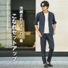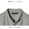 縦のストライプ柄が特徴的な バンドカラーの7分袖シャツと テーパードスラックスのセットアップ。