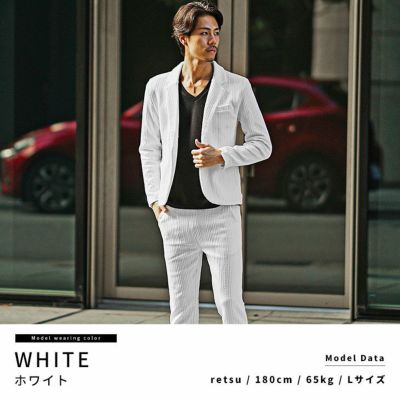 [Lサイズ]を着用しました 他コーデは【コチラ】 ちょうど良いサイズ感でした。ジャケットの着丈はお尻3分の1あたりで、袖丈は手首ジャストです。腕周りが若干のフィット感がありますが、許容範囲内です。パンツの丈はくるぶし上指3本分あたりで、ウエストは拳一つ分の余裕があります。太ももやふくらはぎ周りもジャストです。同じような体型の方はLサイズで良いと思います。