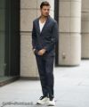 [Lサイズ]を着用しました 他コーデは【コチラ】 程よく余裕のあるサイズ感でした。ジャケットの肩幅はピッタリで、袖丈は手の甲が隠れるあたりです。着丈はお尻が全て隠れます。生地が横伸びするので、窮屈感なく着用いただけます。パンツのウエストは手のひら1枚分の余裕がありますが、ベルトを使えば問題ありません。丈は裾がひと溜まりするくらいで、お尻や渡り、ふくらはぎにゆとりがあります。休日にラクしながらキレイめに過ごしたければLサイズ、フォーマルに着るならMサイズがおすすめです。