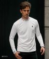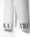 首元には、ブランドネームを高周波プリントで表現し、 凹凸感がさりげないアクセントに。 控えめな高さのモックネックとタイトなシルエットが、すっきりとした上品な印象を与えます。