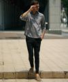 [Lサイズ]を着用しました 他コーデは【コチラ】 胸から肩周りにフィット感があります。着丈はおしりが隠れる長さです。身幅とウエストは余裕があり、窮屈感なく見映え良く着れますね。