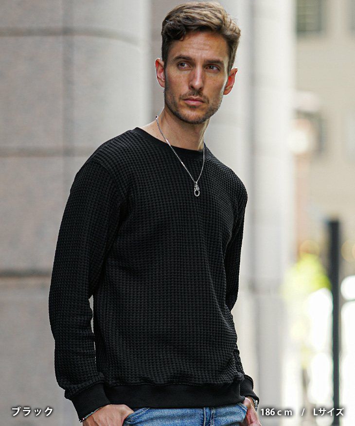 柔らかなワッフル素材を使用したトレーナー。 程よくゆとりのあるシルエットで、 肩の力を抜いた大人のリラックススタイルを叶えます。