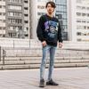 異なるデザインのトレーナーを縫い合わせ リメイクデザインにすることで 洒落感のある着こなしを演出。