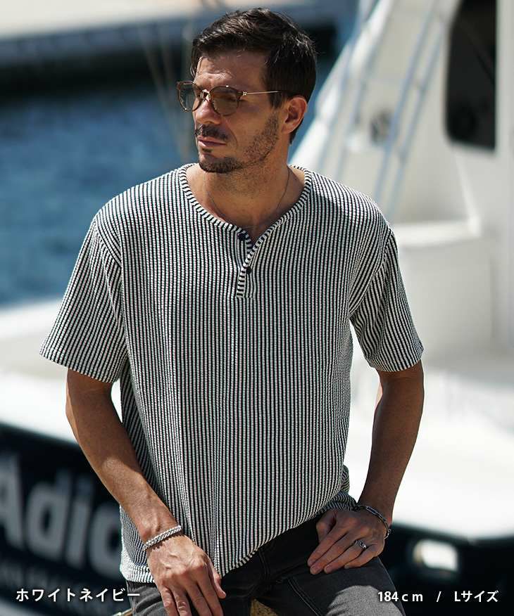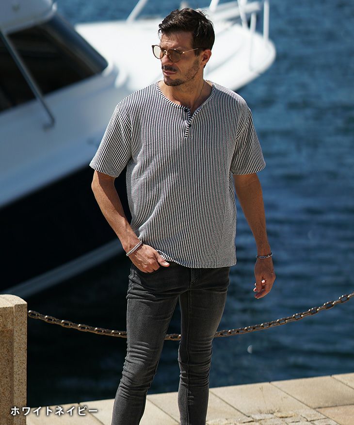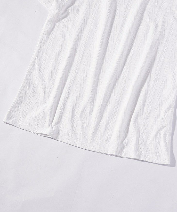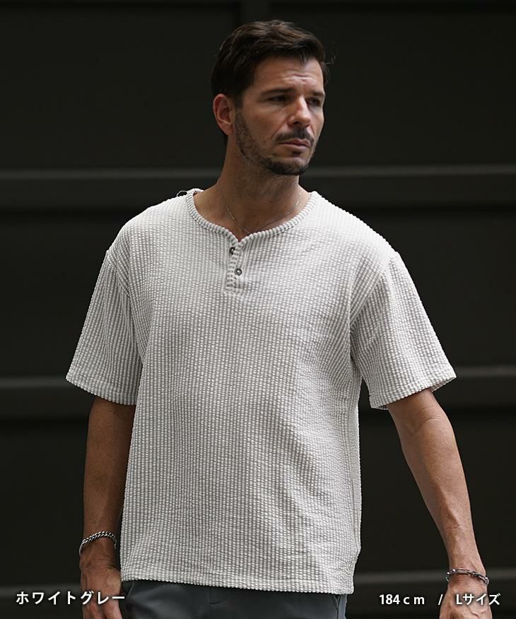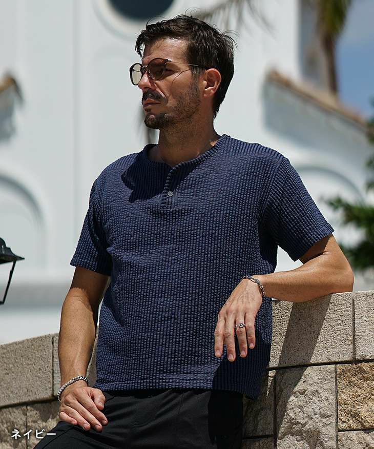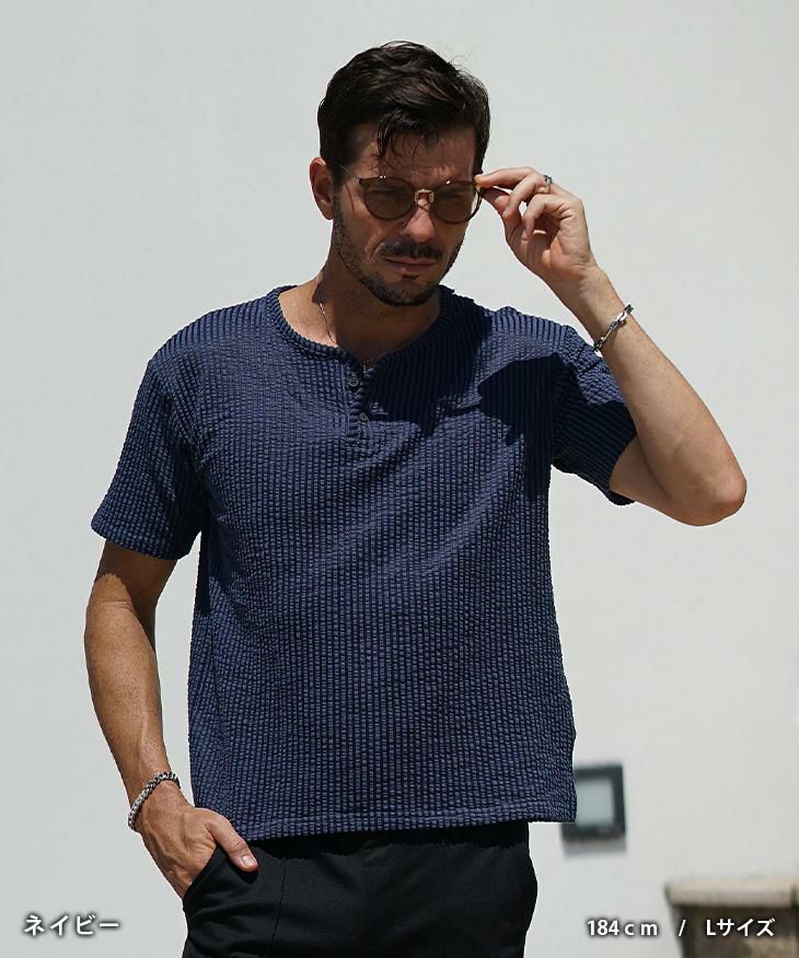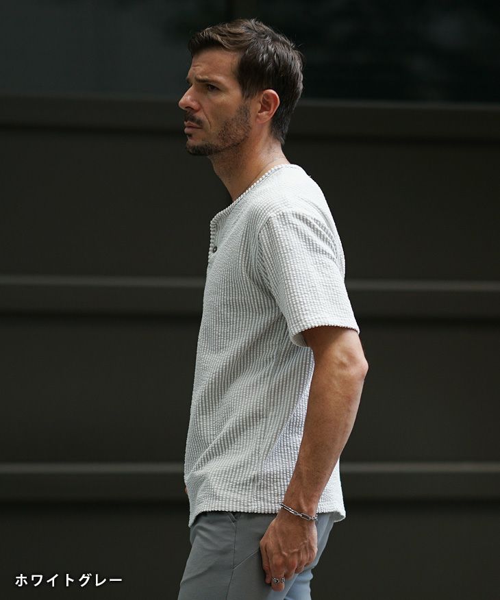 シアサッカーヘンリーネックTシャツ