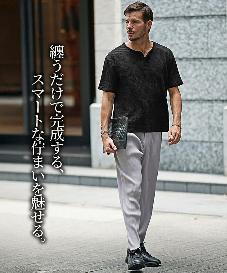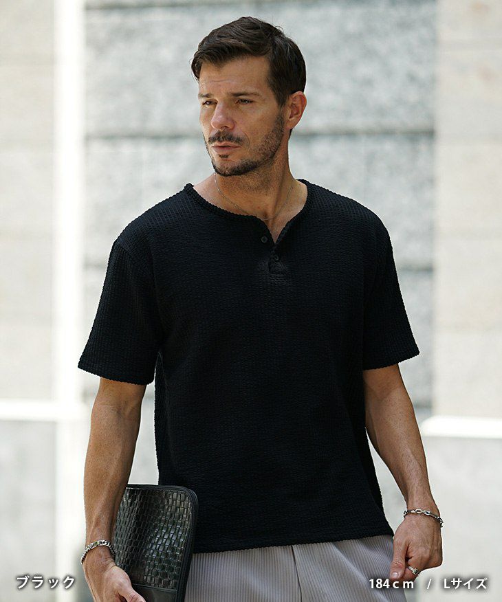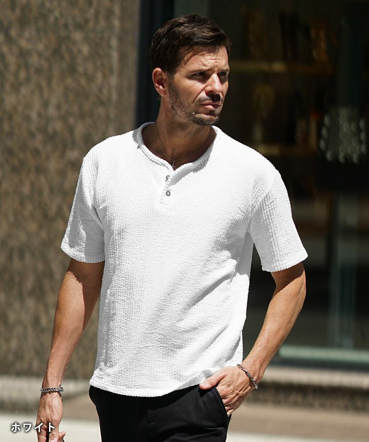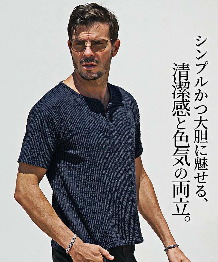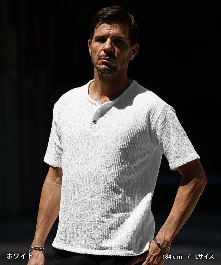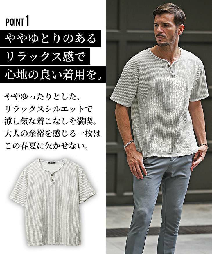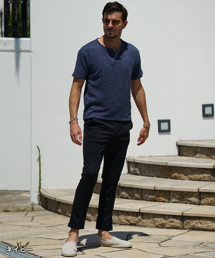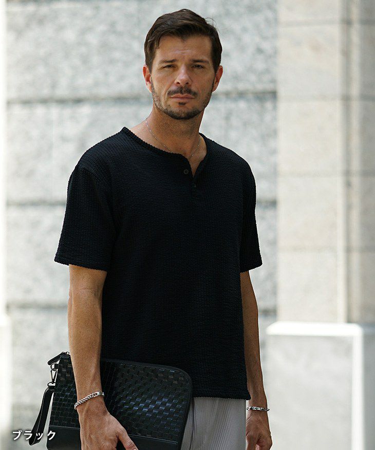 シアサッカーヘンリーネックTシャツ