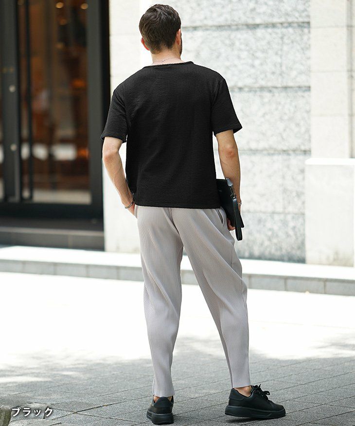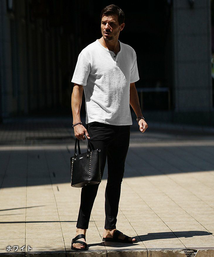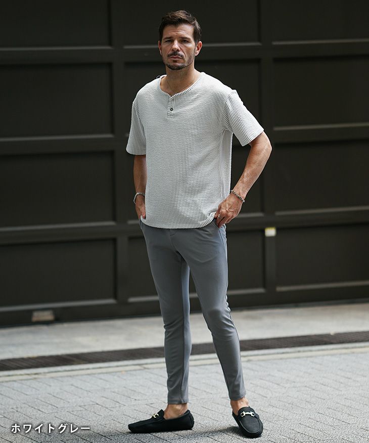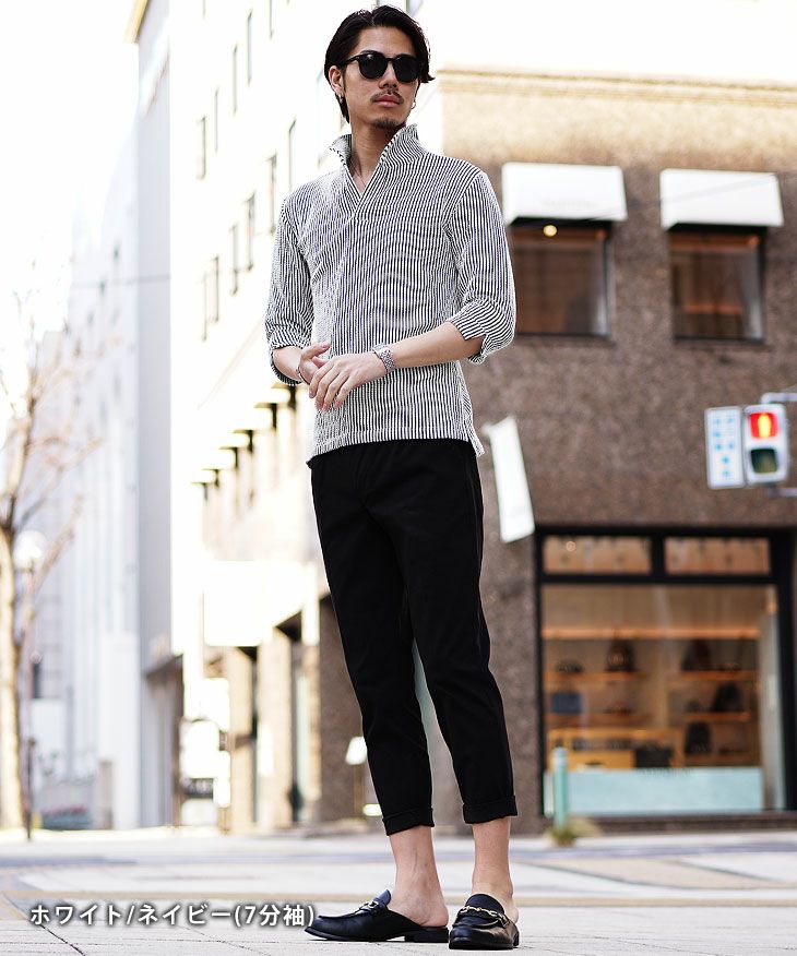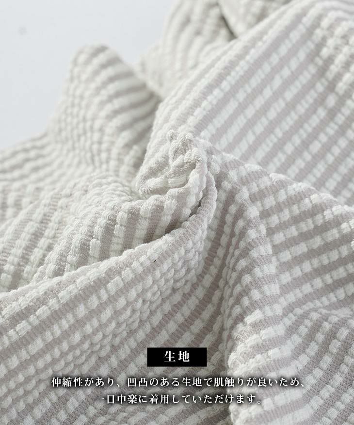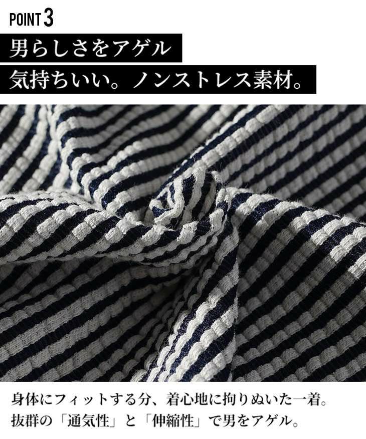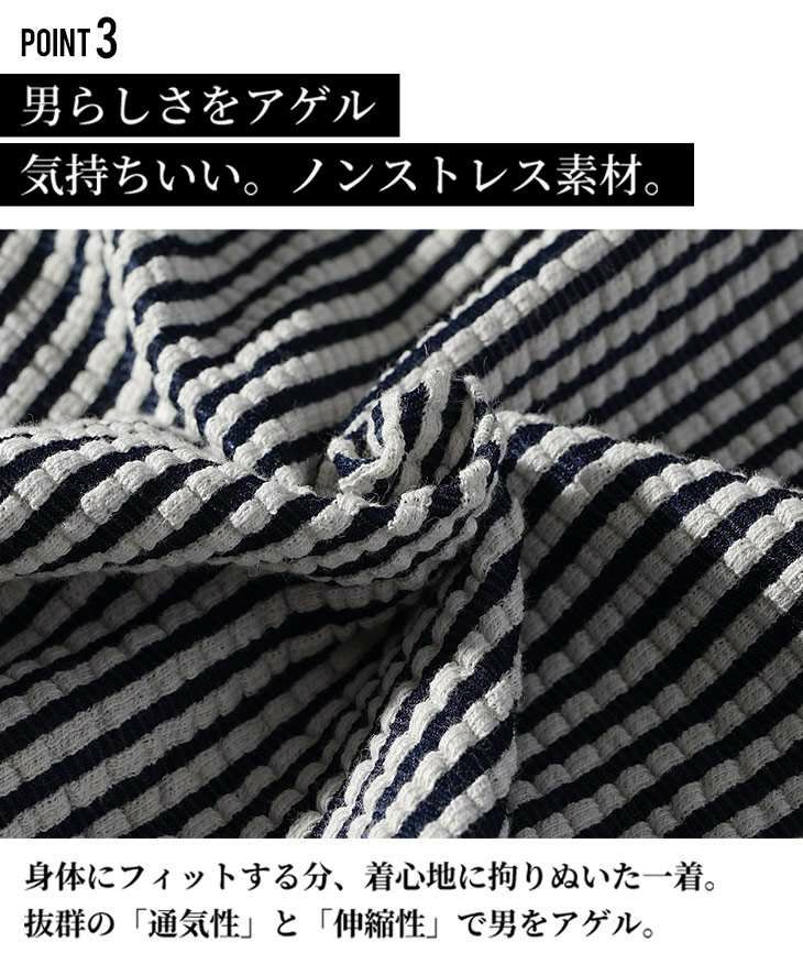 シアサッカーヘンリーネックTシャツ