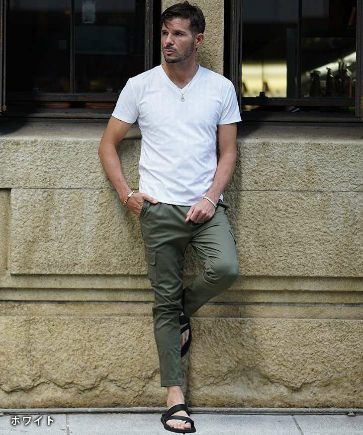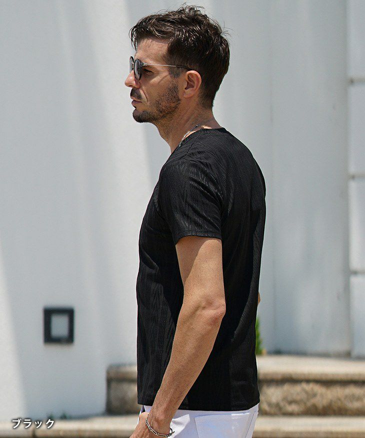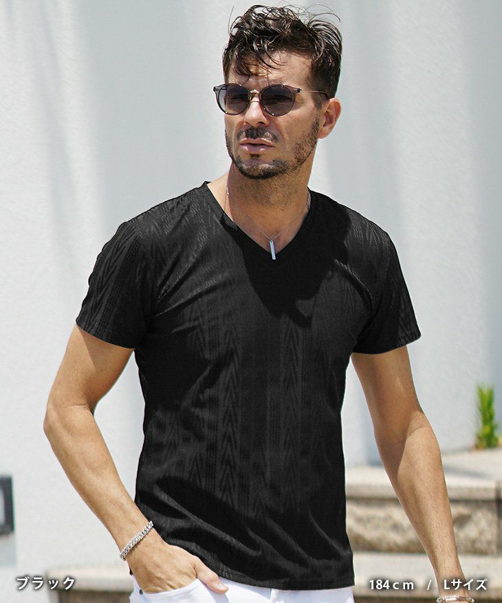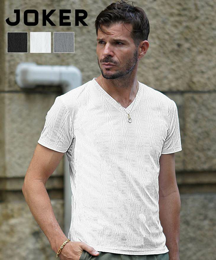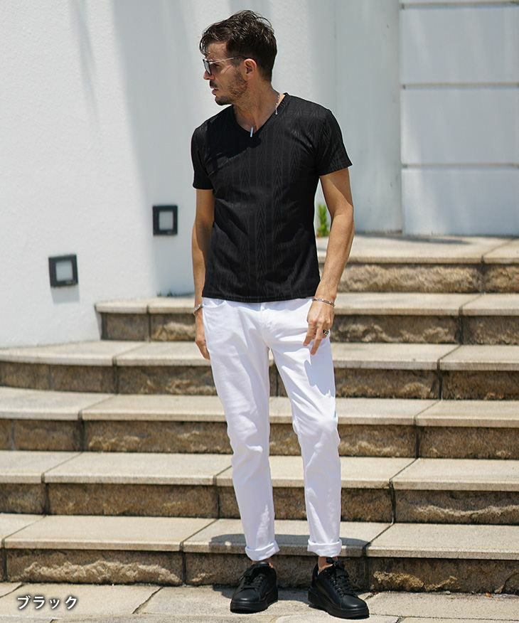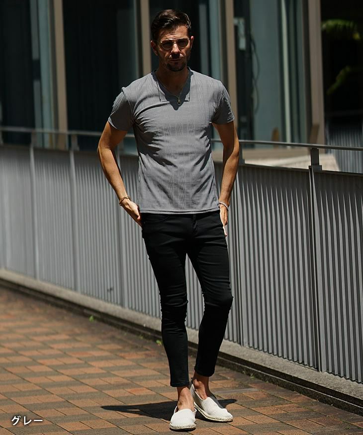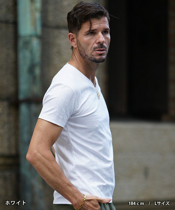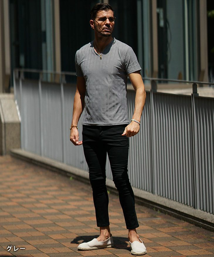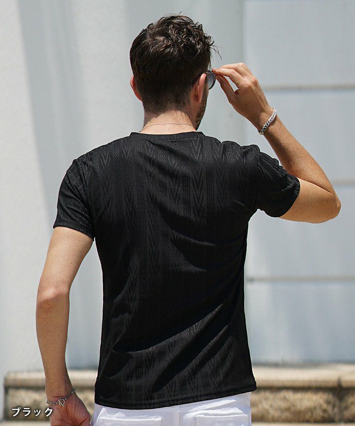 ヘリンボーンコンビ半袖VネックTシャツ