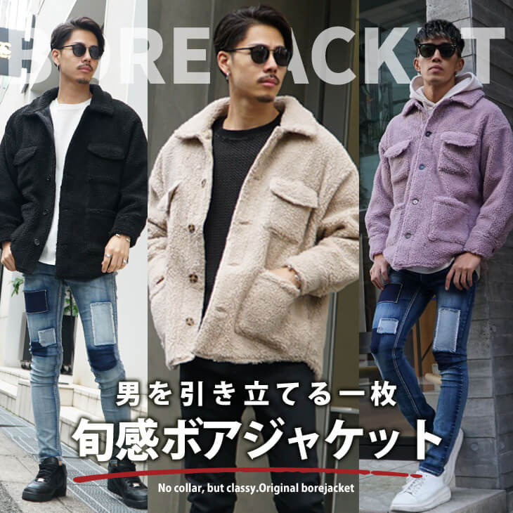 トレンドのCPOジャケットを暖かく、そしてカジュアルで可愛らしいボア素材で仕立てることにより、男らしさを引き立ててくれる仕上がりになっています。