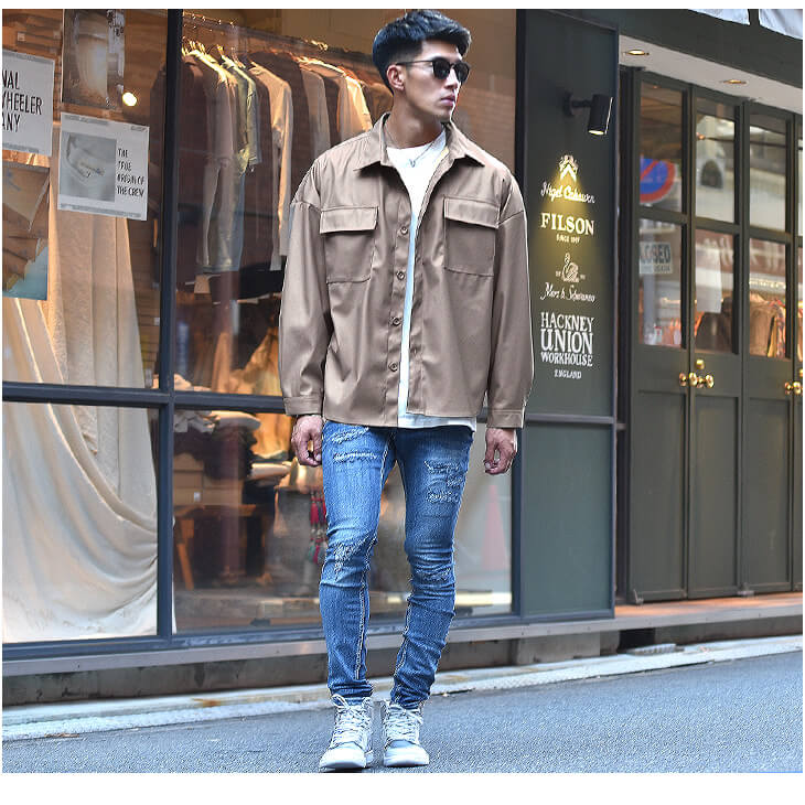 ダメージデニムは少しきついイメージがあるかもしれませんが、大きめのCPOシャツと組み合わせることで、周囲の目線は上に向くので、ダメージデニムがコーデの邪魔をしないのでオススメです!