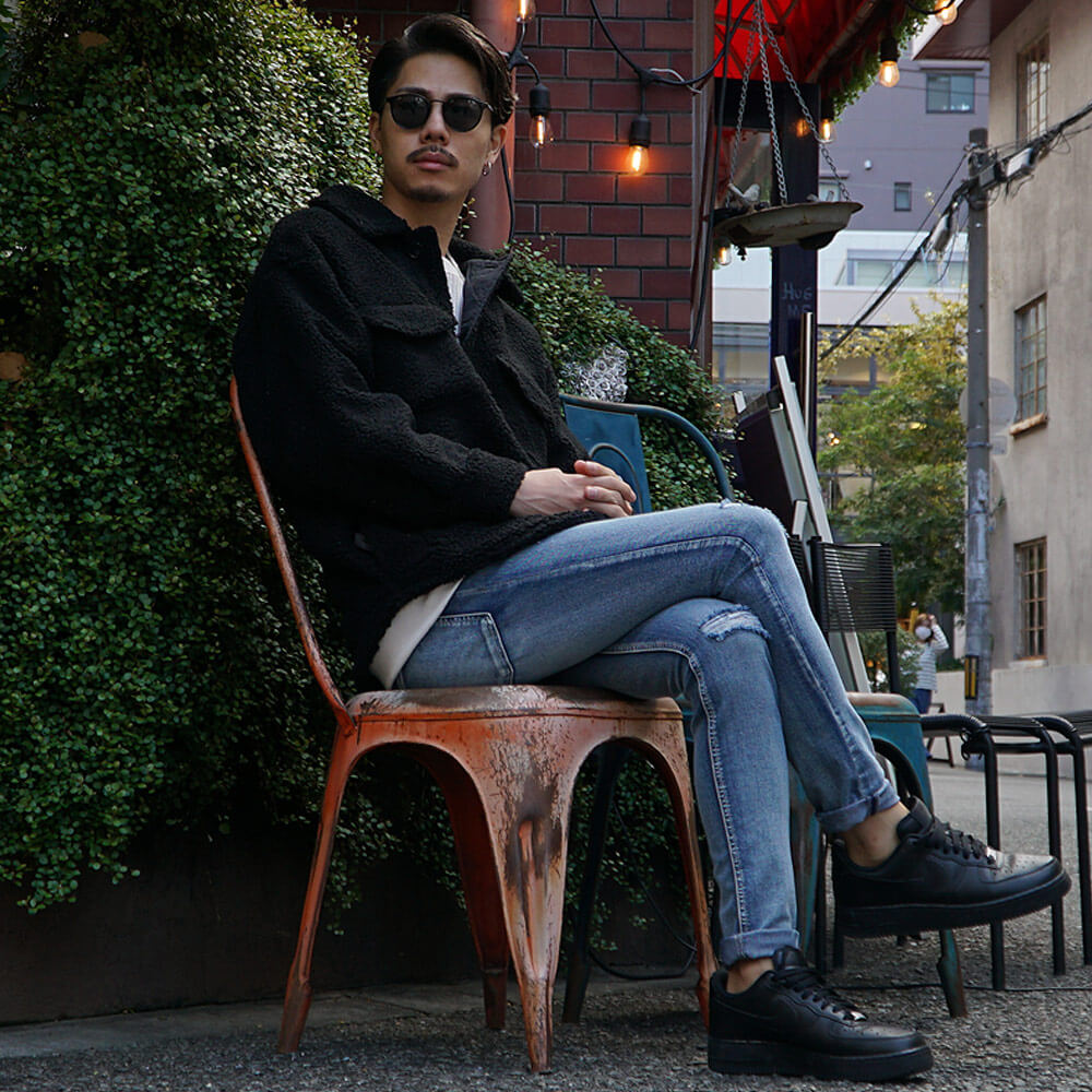 ブラックアウターにデニムパンツを合わせる定番コーデはインナーも合わせやすく、まずCPOを試したい!といった人にはオススメのコーディネートです。