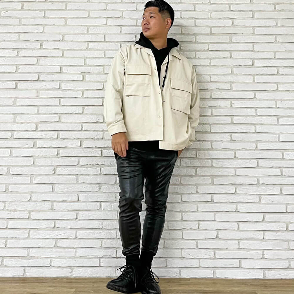 シンセティックレザー素材を用いたCPOシャツを取り入れることで、トレンド感溢れる大人っぽさを演出するコーデ。