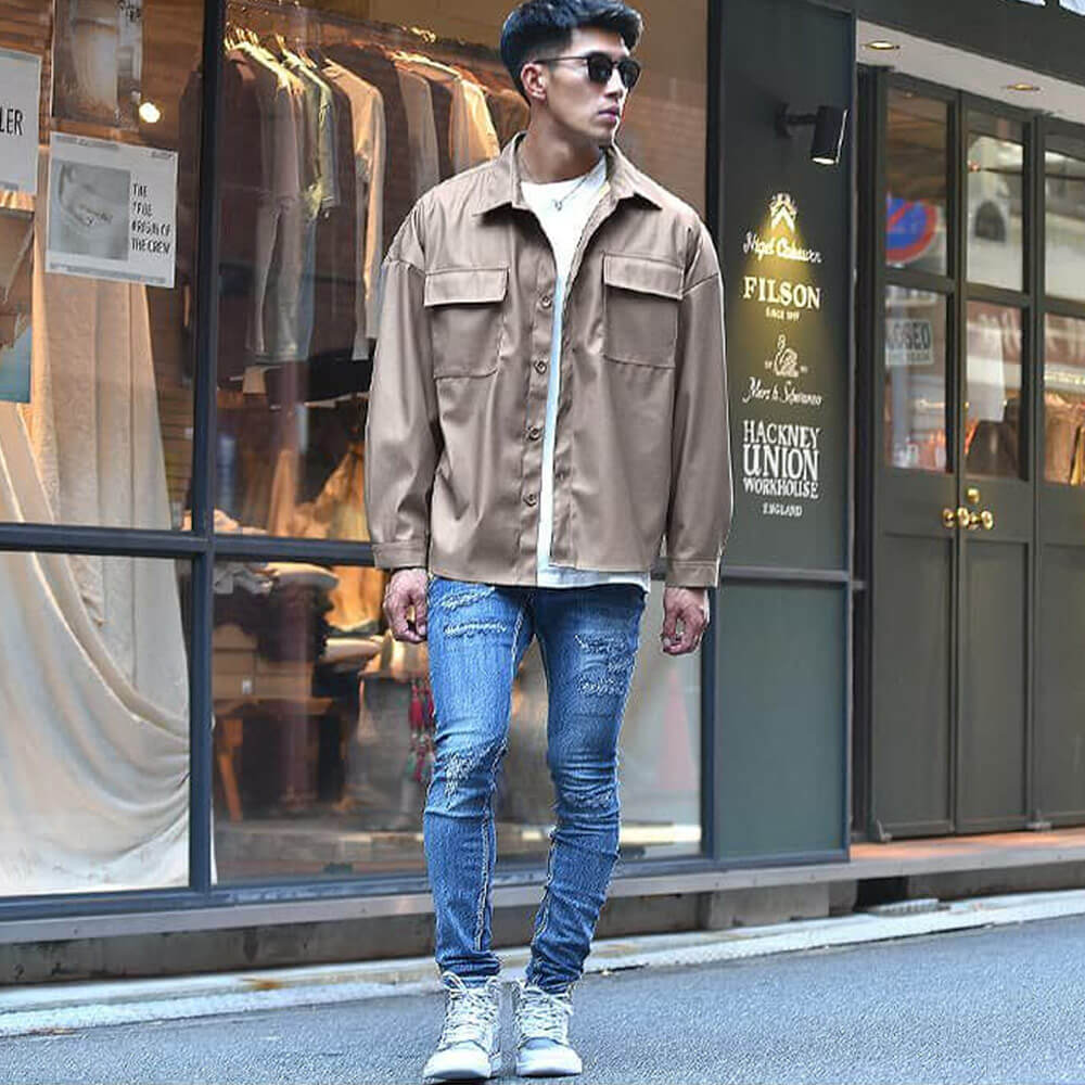 ベージュのCPOシャツにダメージデニムを合わせたコーデ。
