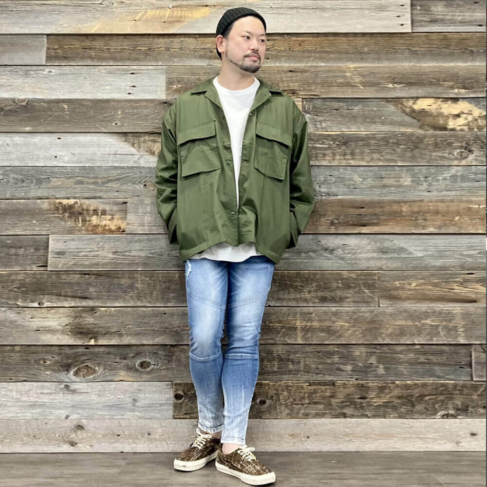 CPOジャケットとカーゴパンツを合わせたミリタリー風コーデ。