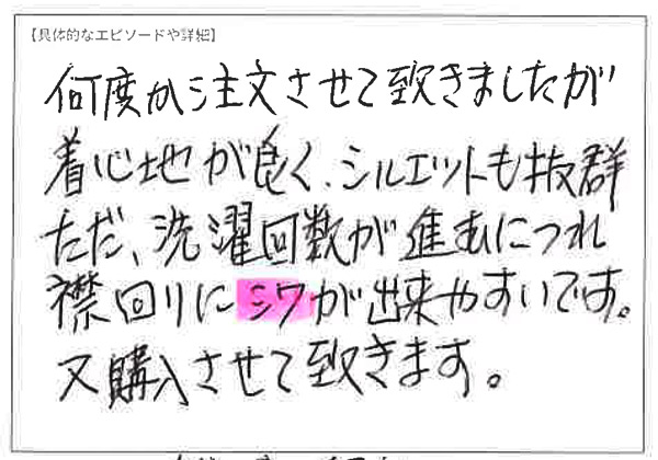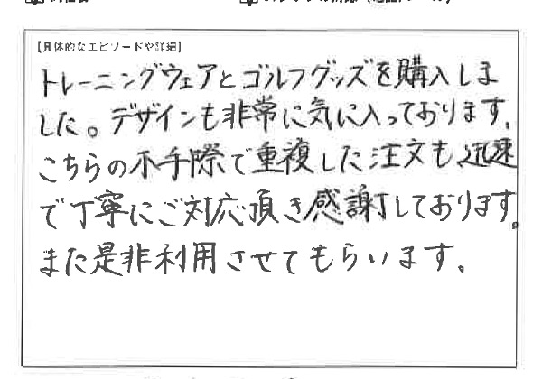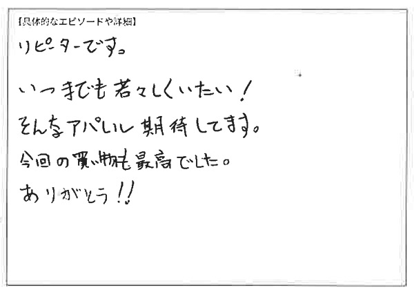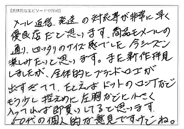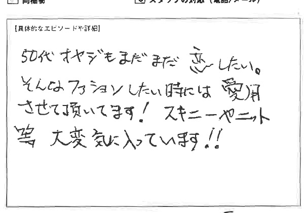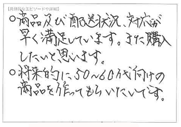 商品だけでなく、当店の対応につきましてもお褒めのお言葉をありがとうございます!年代別にご提案できるアイテムの開発も前向きに検討して参ります^^
