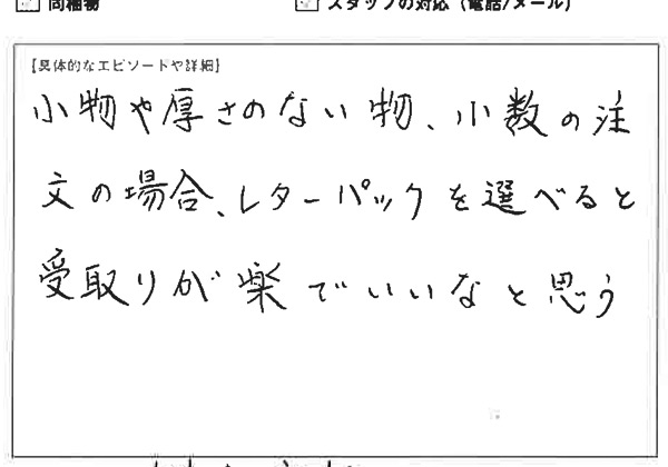 ご利用いただいたお客様のご意見ハガキの中に、大変有難いお言葉から商品開発のアイデアになるご意見等、多数のお声をいただいており、いつもスタッフ一同の励みになっております。