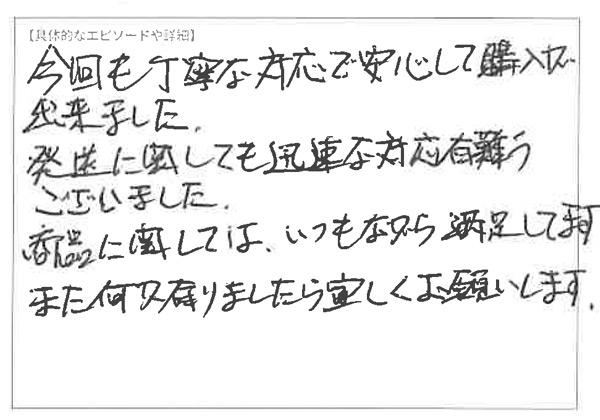 当店の対応につきまして、お褒めのお言葉をいただきありがとうございます!またのご利用心よりお待ちしております。