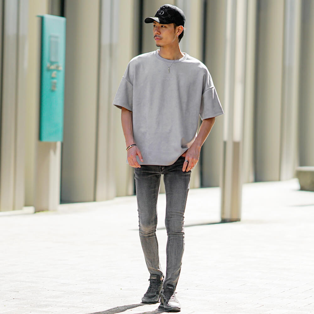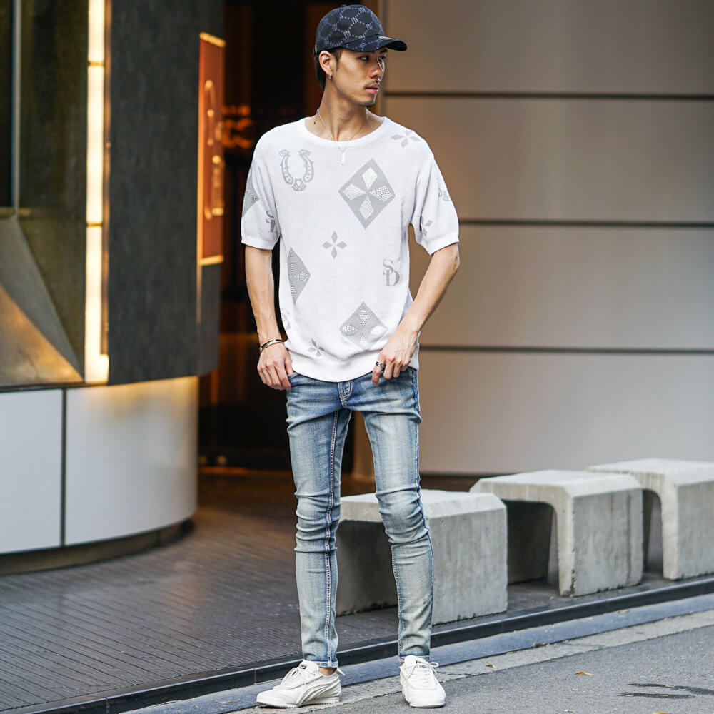 やんちゃ感を出しつつ、パッチワークスキニーパンツとキャップをあわせることでシルエットにメリハリを出しておしゃれ上級者になれるコーデはこれ。