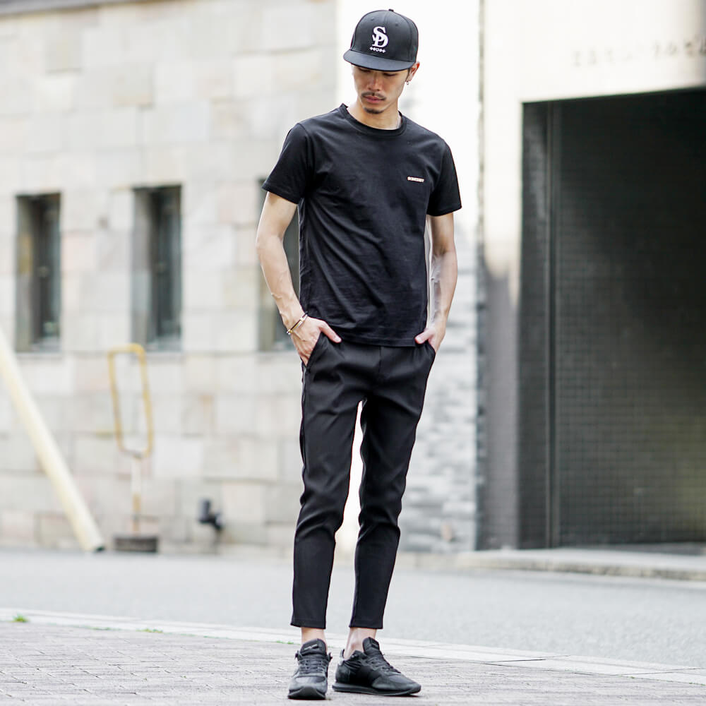 ストリート系コーデに黒のキャップをかぶり、Tシャツとデニムパンツを合わせたコーデがおススメです。