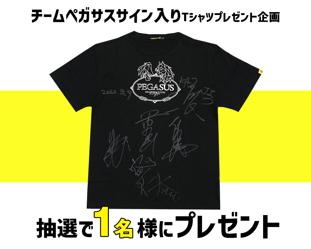 チームペガサスの梶原代表をはじめ、瓦田脩二選手、軍司泰斗選手、寧仁太アリ選手、璃明武選手の全員の直筆サイン入りTシャツを抽選で1名様にプレゼントします!