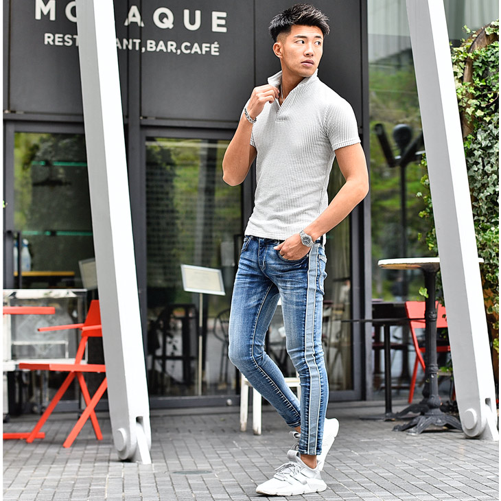 シャツと同様に襟を立てて着れば、ちょっと大人なカジュアルスタイルにもなります。