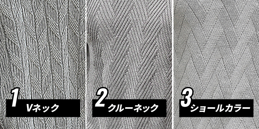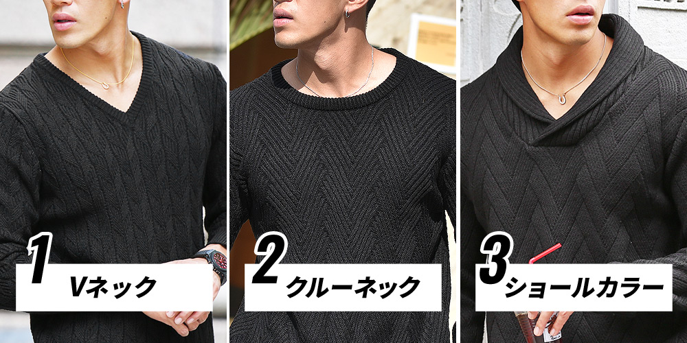 首の形ごとに、編みのパターンを変えてシンプル過ぎないデザインに仕上がっており、 無地ニットなのに変化に富んだ存在感があります。
