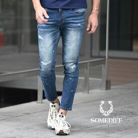 柔らかい印象のベージュのにはリペアダメージデニムでハードさをプラスして、