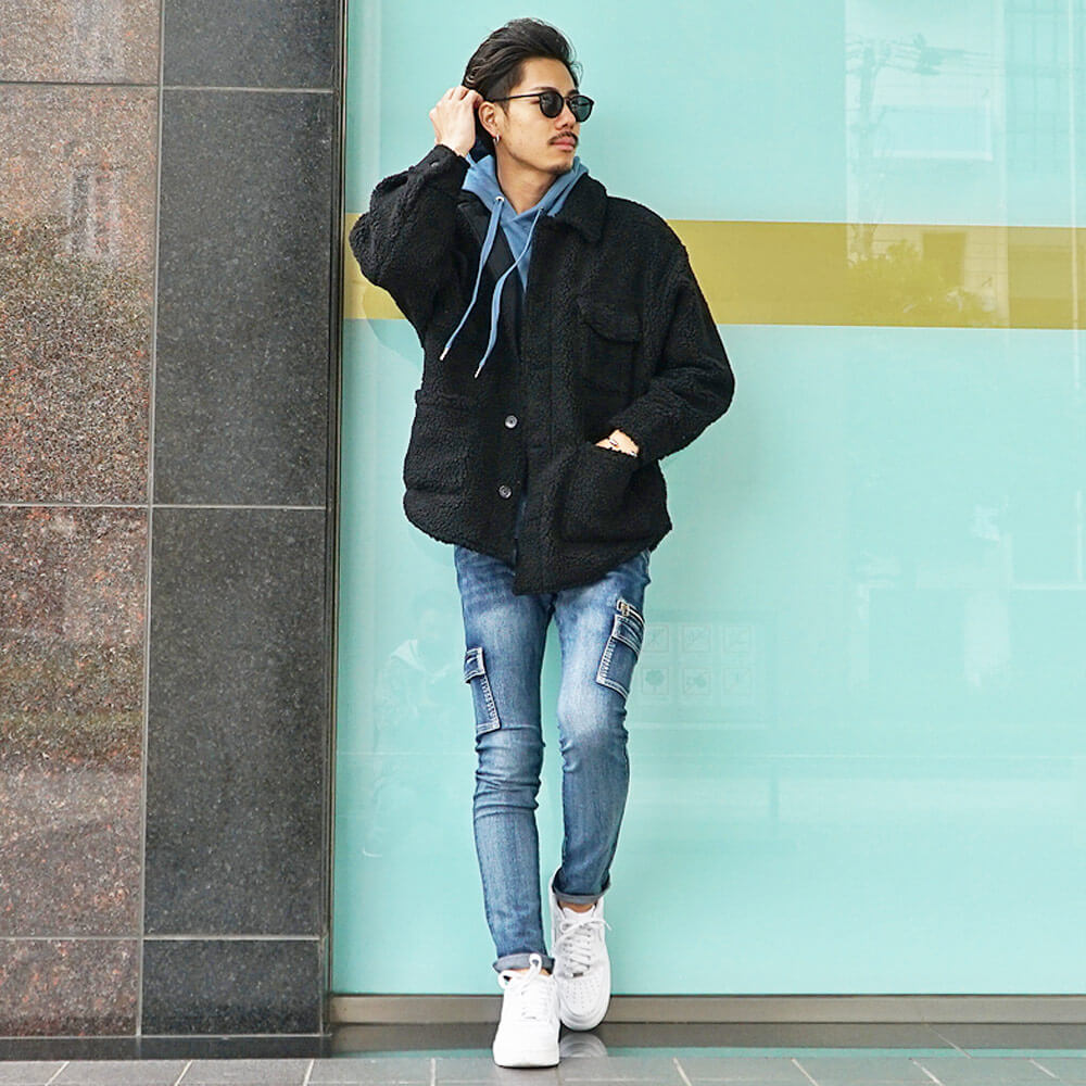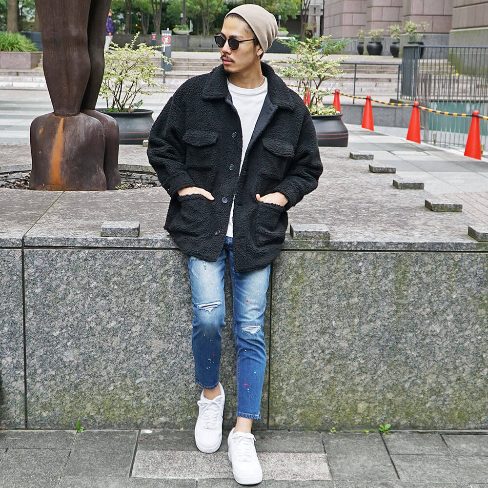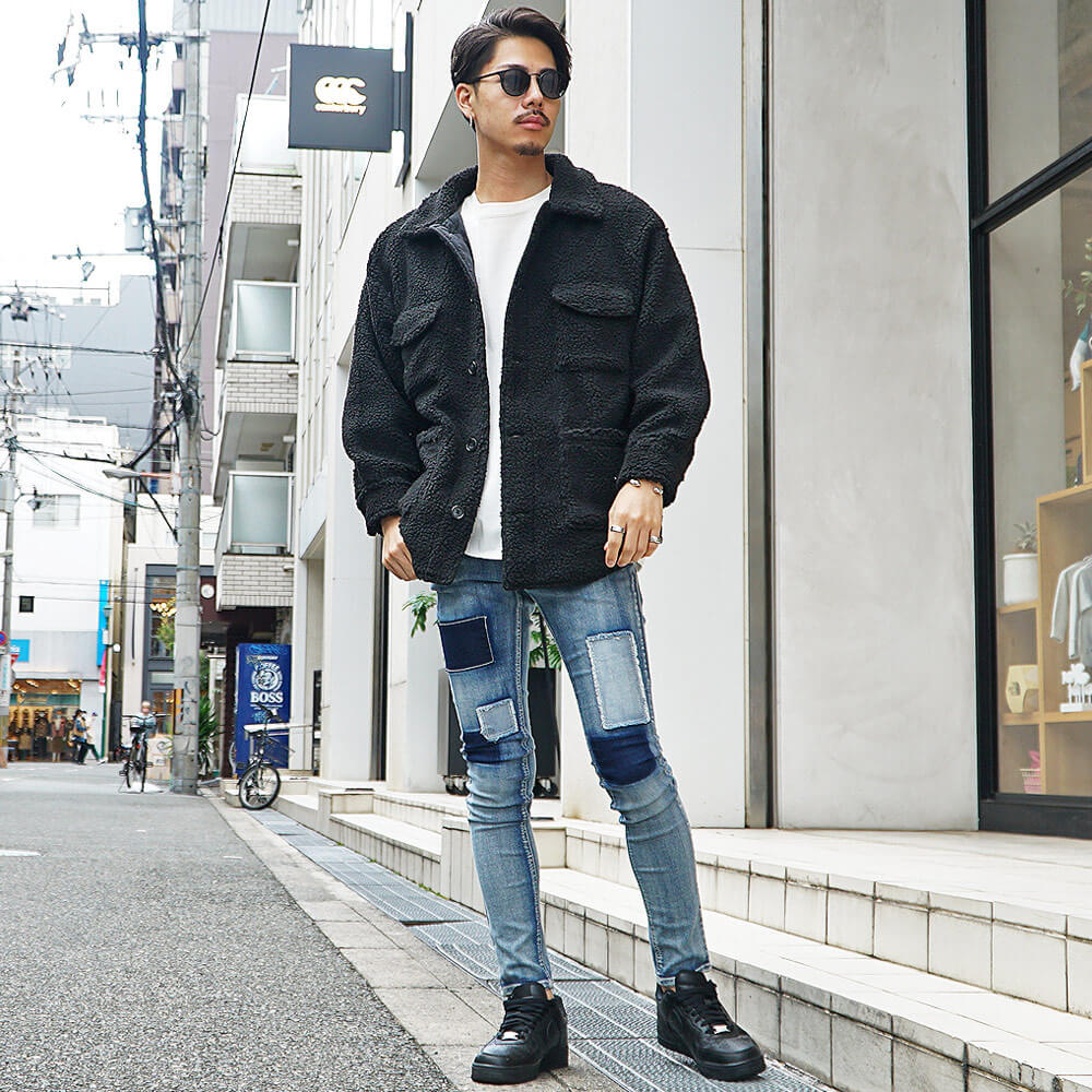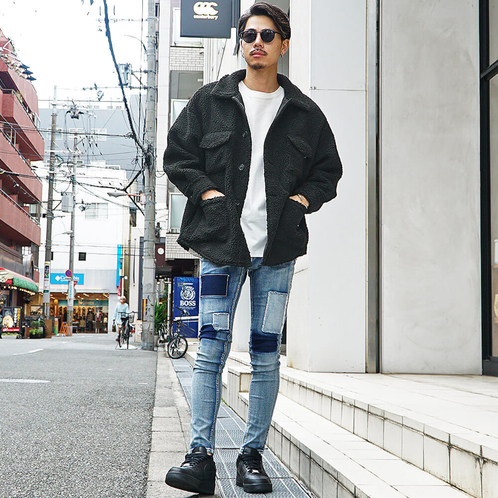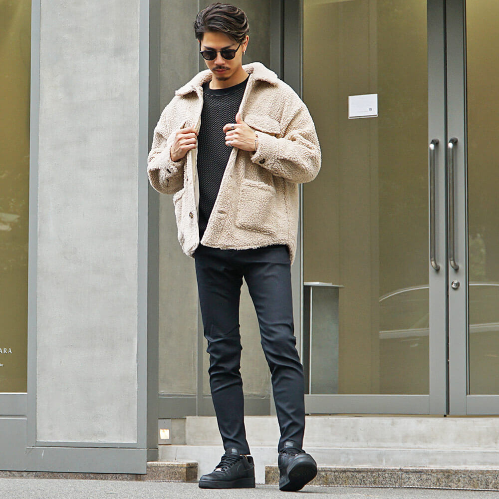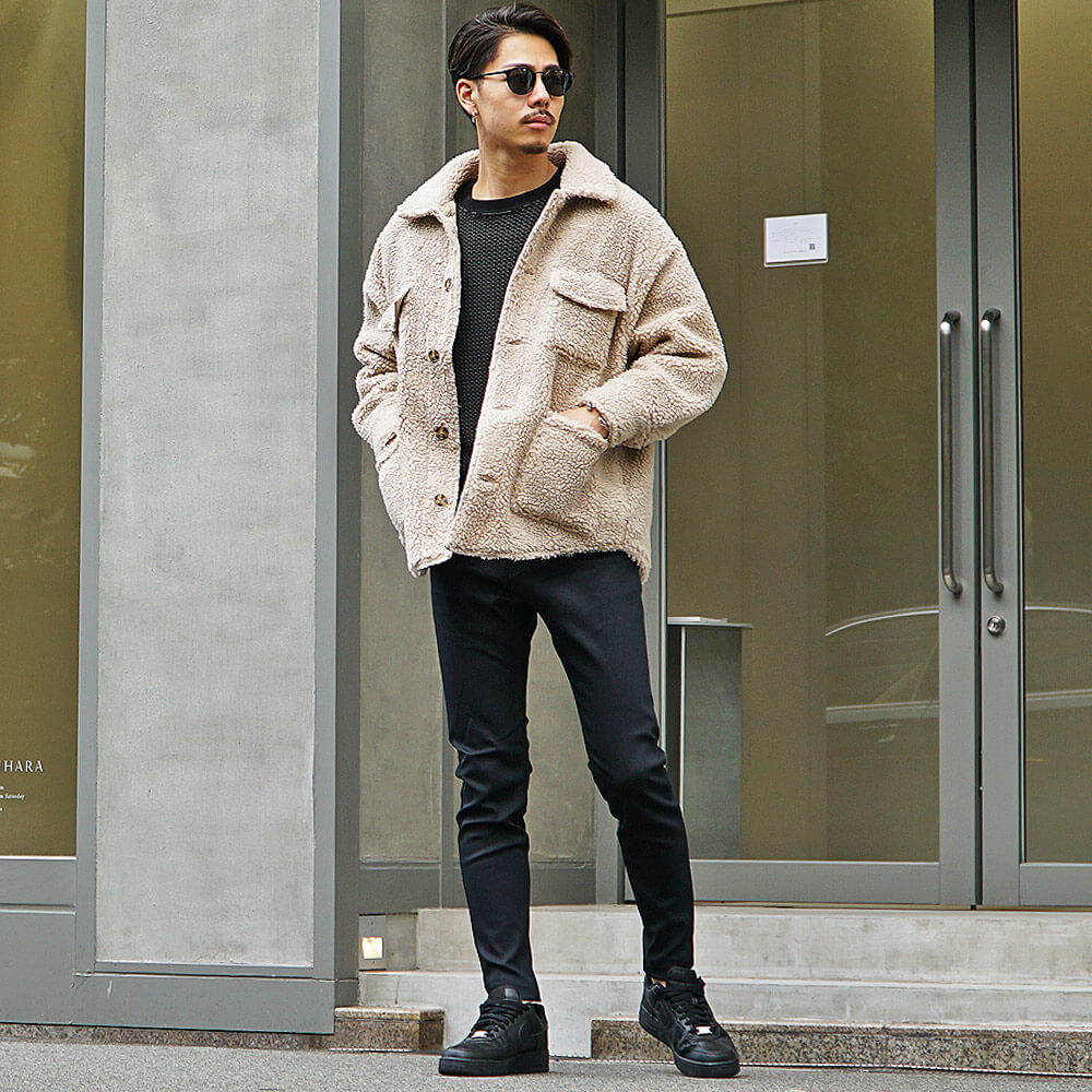 黒スキニーで合わせるボアジャケットメンズコーデ