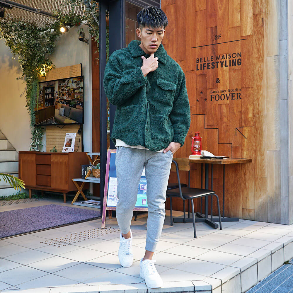 ボアジャケット(グリーン)×スウェットパンツコーデ