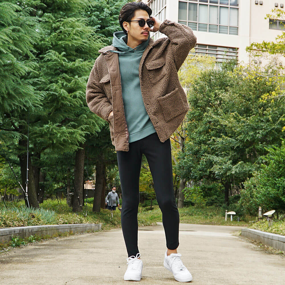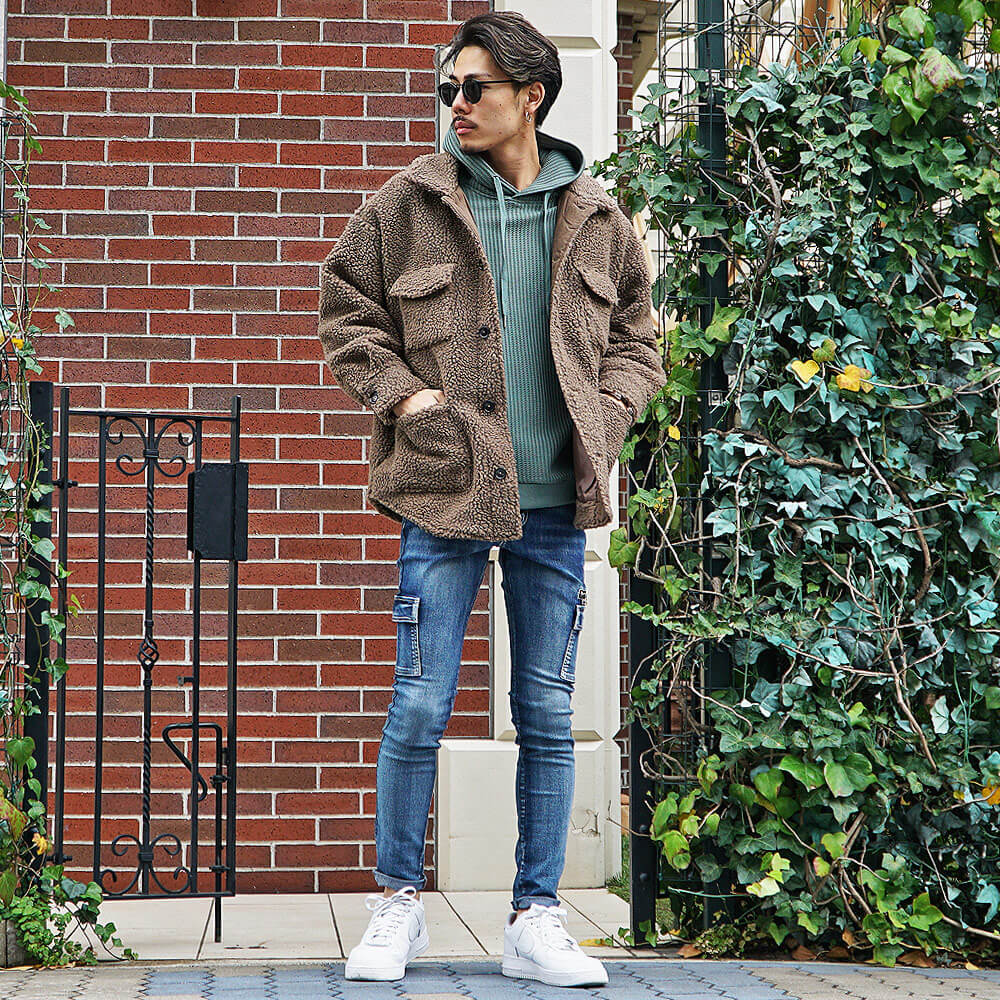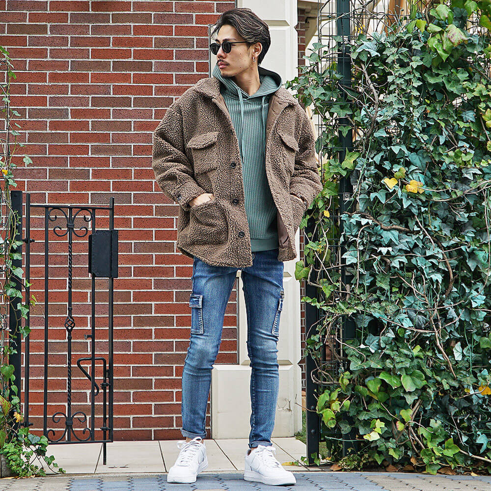 パーカー×ボアジャケットメンズコーデ