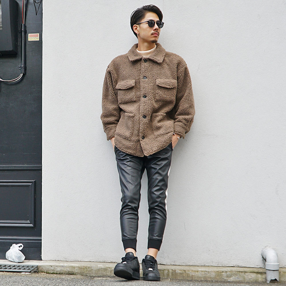 カジュアルな印象のボアジャケットのインナーにはモックネックを合わせ、ボトムスには艶感のあるレザージョガーパンツを合わせることにより、大人っぽさがグッと高まるので他者との差をつけれるチャンスです!