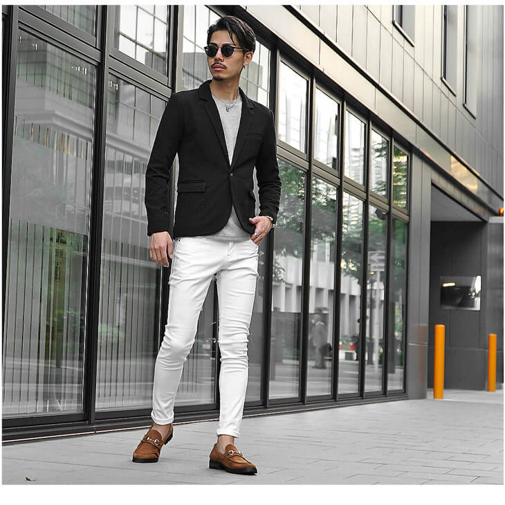 テーラードジャケットに合わせるパンツに関して、インナーに合わせたシャツをパンツにインすることによりスッキリとまとまり、 キレイな印象付けもできるのでトップスばかりに目が行きがちですが、 パンツにインするのも着こなしのテクニックになるので意識しましょう! そして!服装のシルエットが重要なので細身を選びましょう。 ただ、単純に細ければいいというもんでもないので、服装全体でアルファベットのIを表現した『Iラインシルエット』を意識してサイズ選びをしましょうね。
