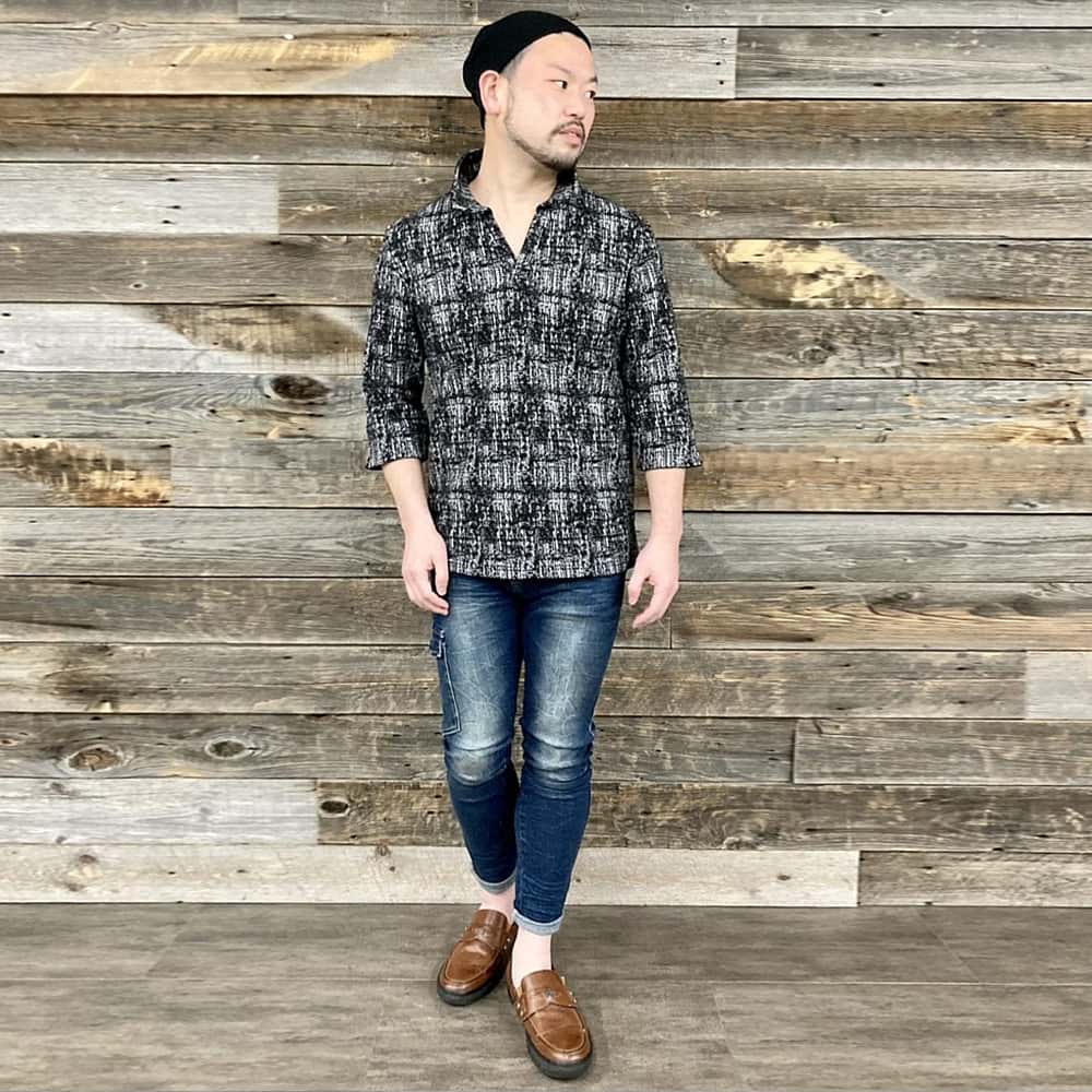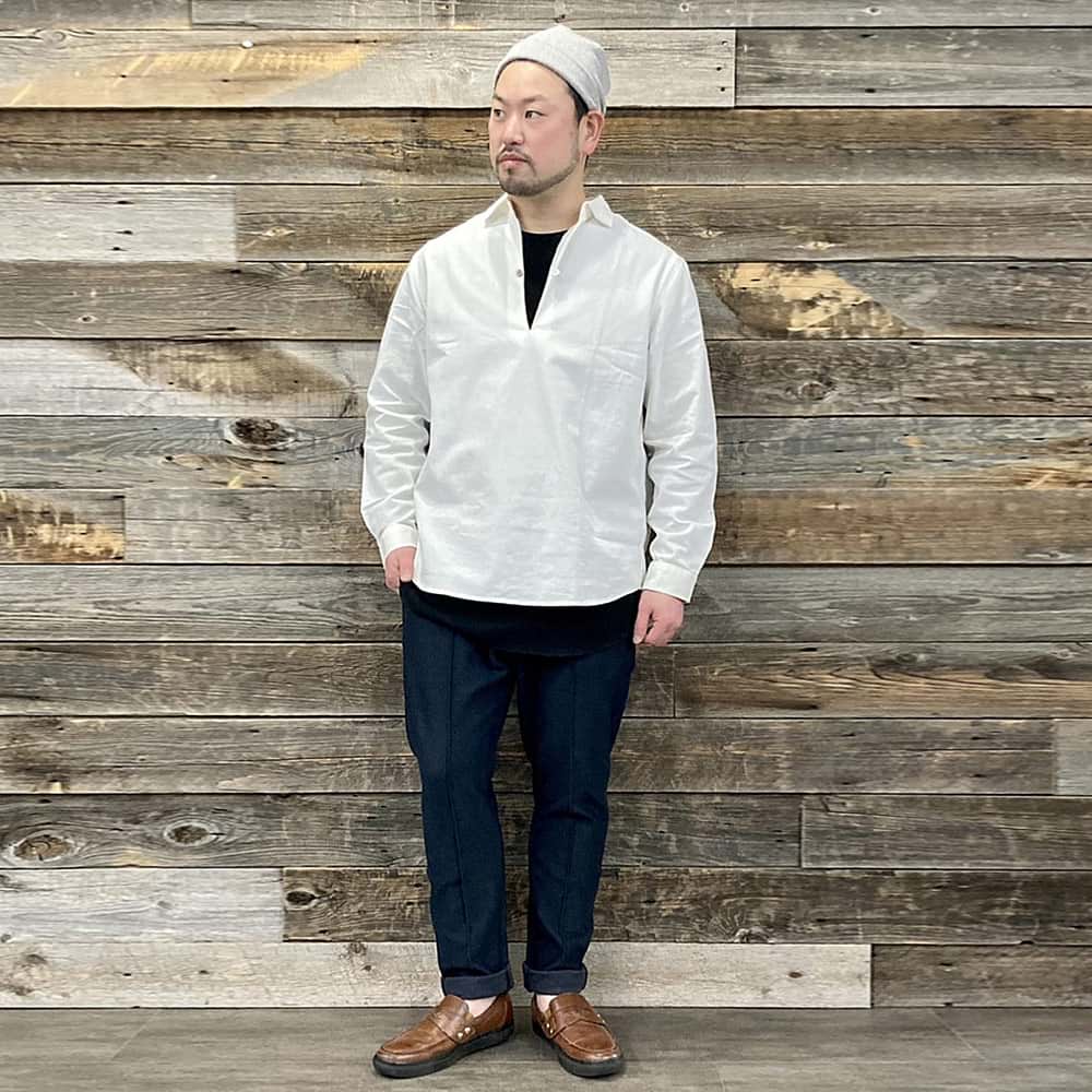 襟のあるシャツも輪郭周りを細く見せてくれる効果があるので、ぜひお試しください!