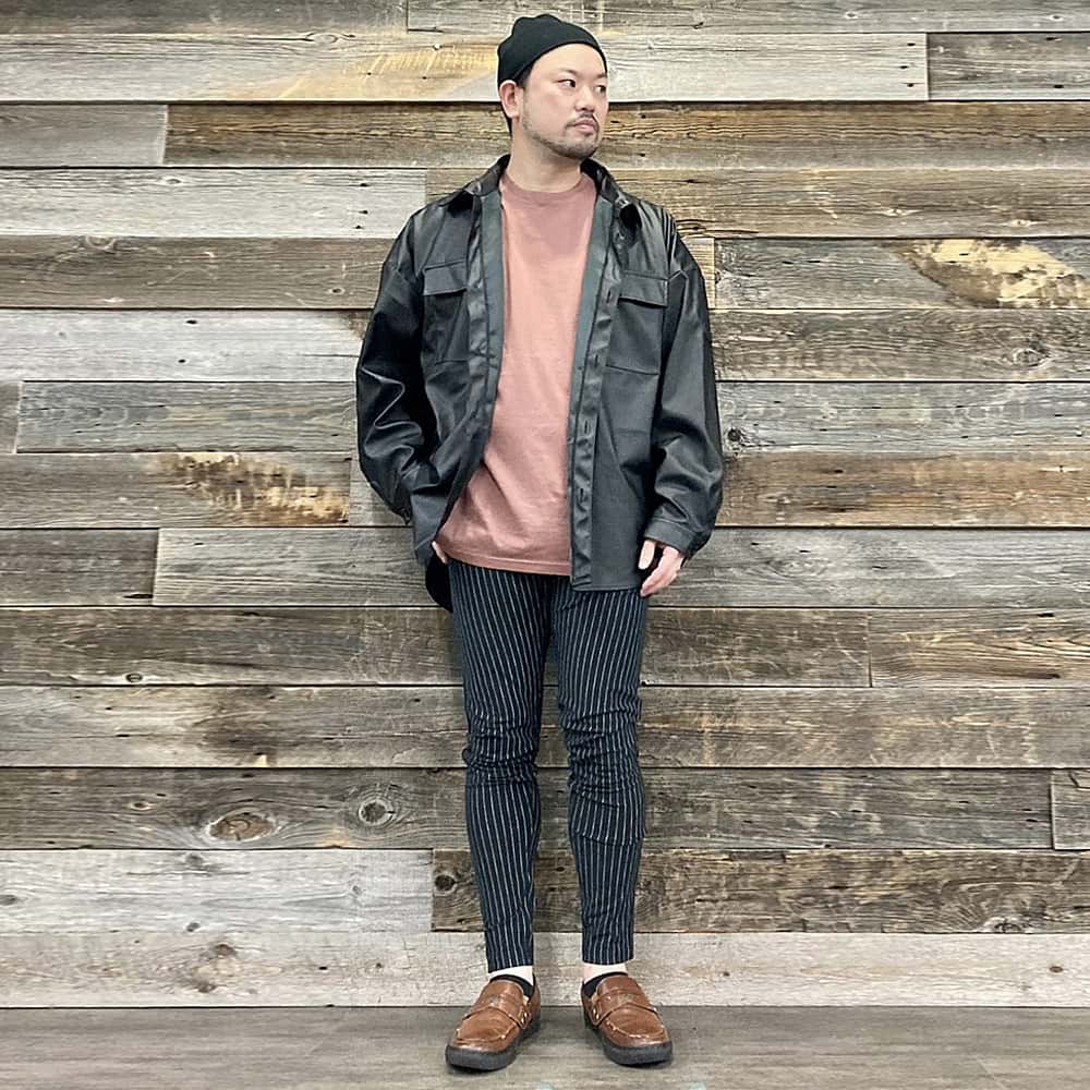 トップスやシャツ、ジャケットなどの上半身のアイテムをオーバーサイズにすることで細身パンツとのシルエットバランスにメリハリがついて細見え効果に加え、トレンド感のある雰囲気に仕上がります。